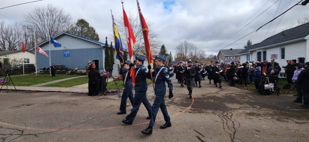 Après le discours de M. Leroux, le révérend Matthew Kingswood a lu un extrait des Écritures en hommage à ceux qui ont donné leur vie au cours des guerres mondiales et de la guerre de Corée. La foule a lu le poème « In Flander’s Fields », sous la direction de Robin Chalmers, puis la sonnerie aux morts a marqué le début des deux minutes de silence habituelles. Les cornemuses et tambours calédoniens ont entonné la complainte, puis Bill Norman et Christine Durocher ont lu l’Acte du souvenir.